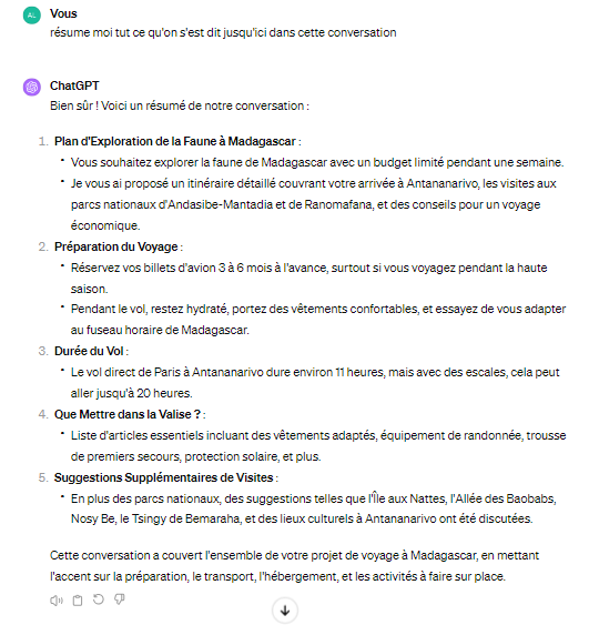Au bout d’un moment, il n’aura plus les détails du type de vols que vous lui avez demandé. Une simple phrase pour lui demander de résumé la conversation et c’est reparti 😉